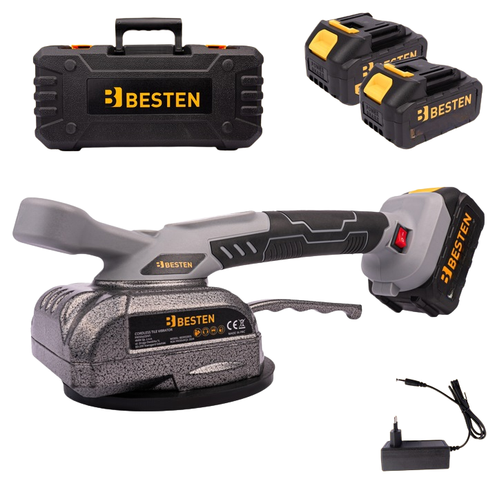 Акумуляторна віброприсоска для плитки BESTEN BE0002855 із 2 АКБ 24V/5Ah у пластиковому кейсі, призначена для укладання плитки, керамограніту та кам’яних покриттів.