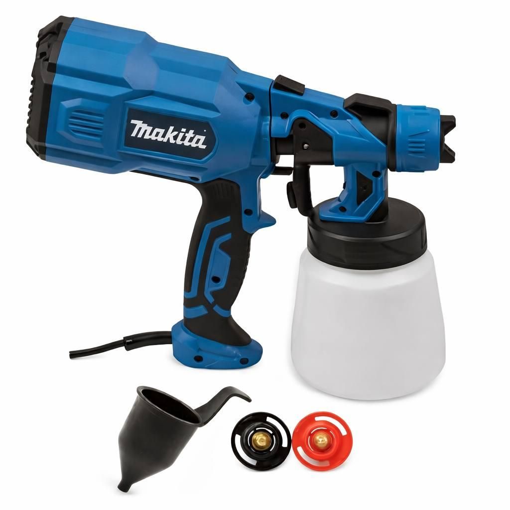 Електричний фарборозпилювач Makita призначений для нанесення різних видів фарб, ґрунтовок і лаків. Оснащений баком об'ємом 1,4 л та системою регулювання інтенсивності розпилення, що робить його зручним для фарбування автомобілів, стін, стель, меблів і садових робіт.