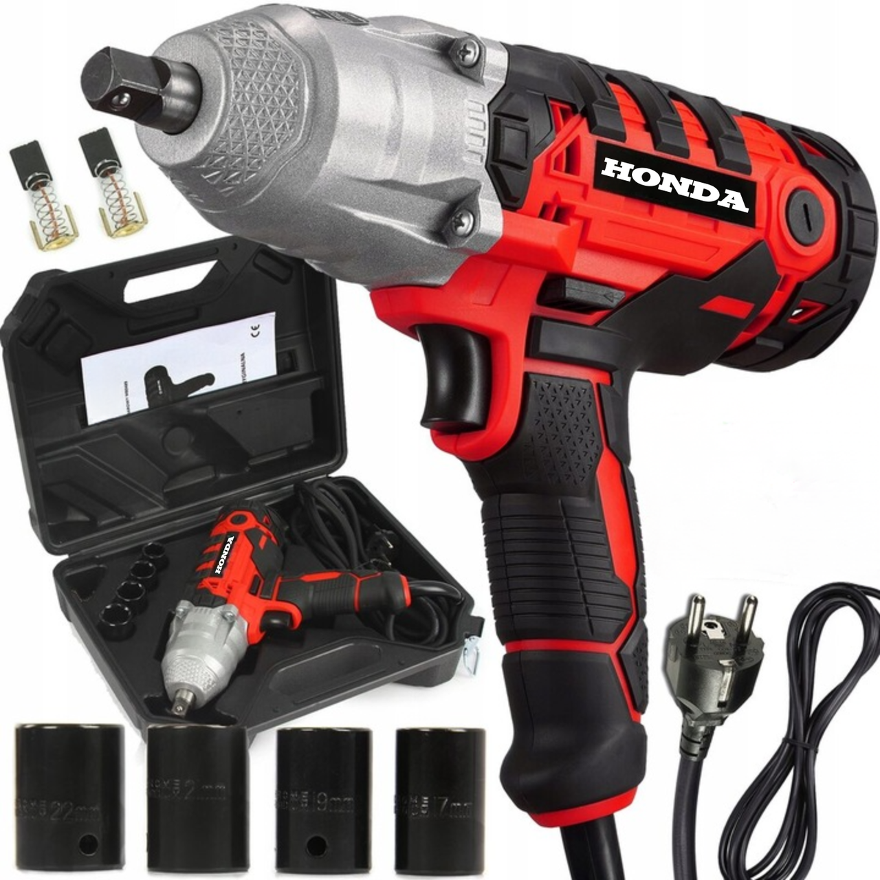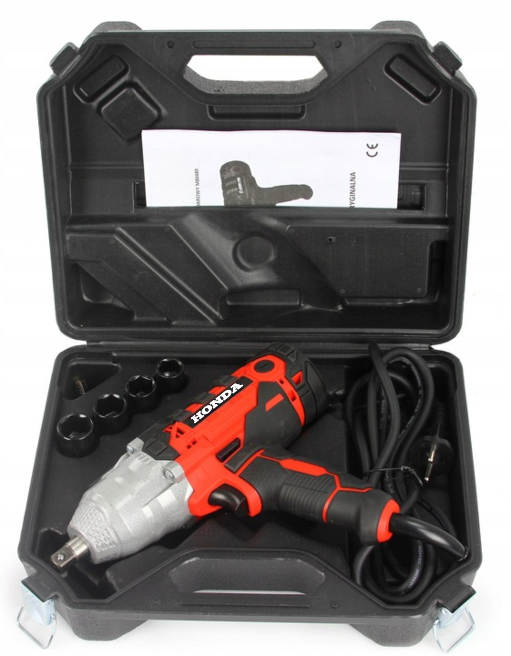 Мережевий ударний гайковерт Honda для коліс із крутним моментом 550 Нм та двигуном 2 кВт. Призначений для монтажу та демонтажу болтів і гайок, постачається з набором торцевих головок у пластиковому кейсі.