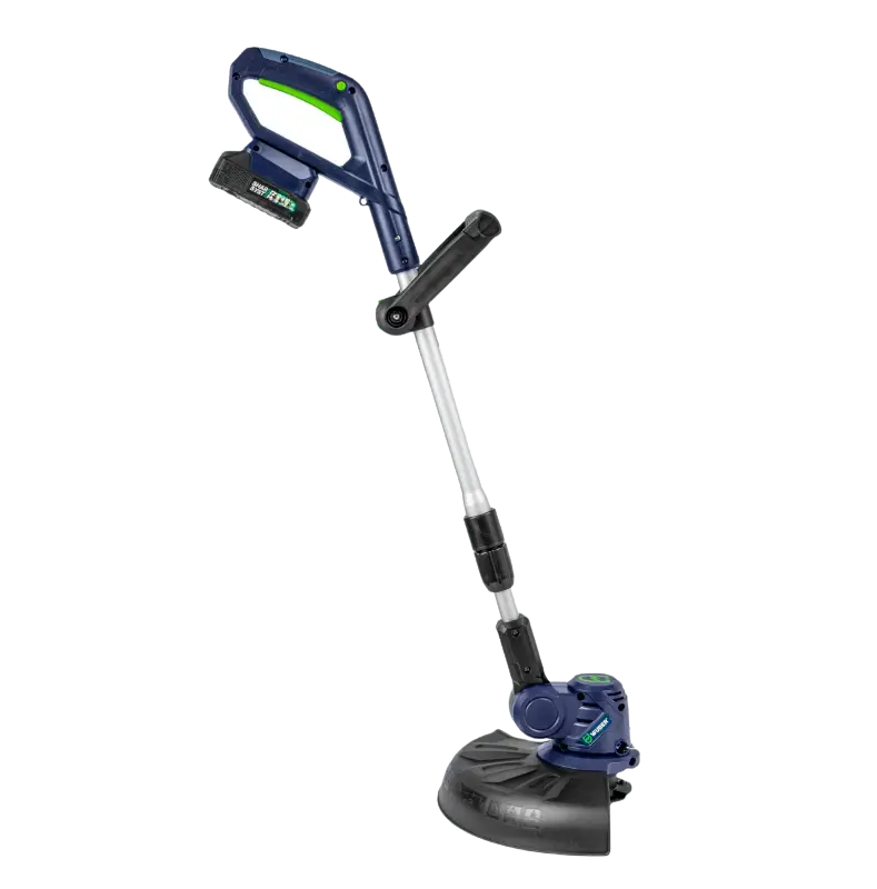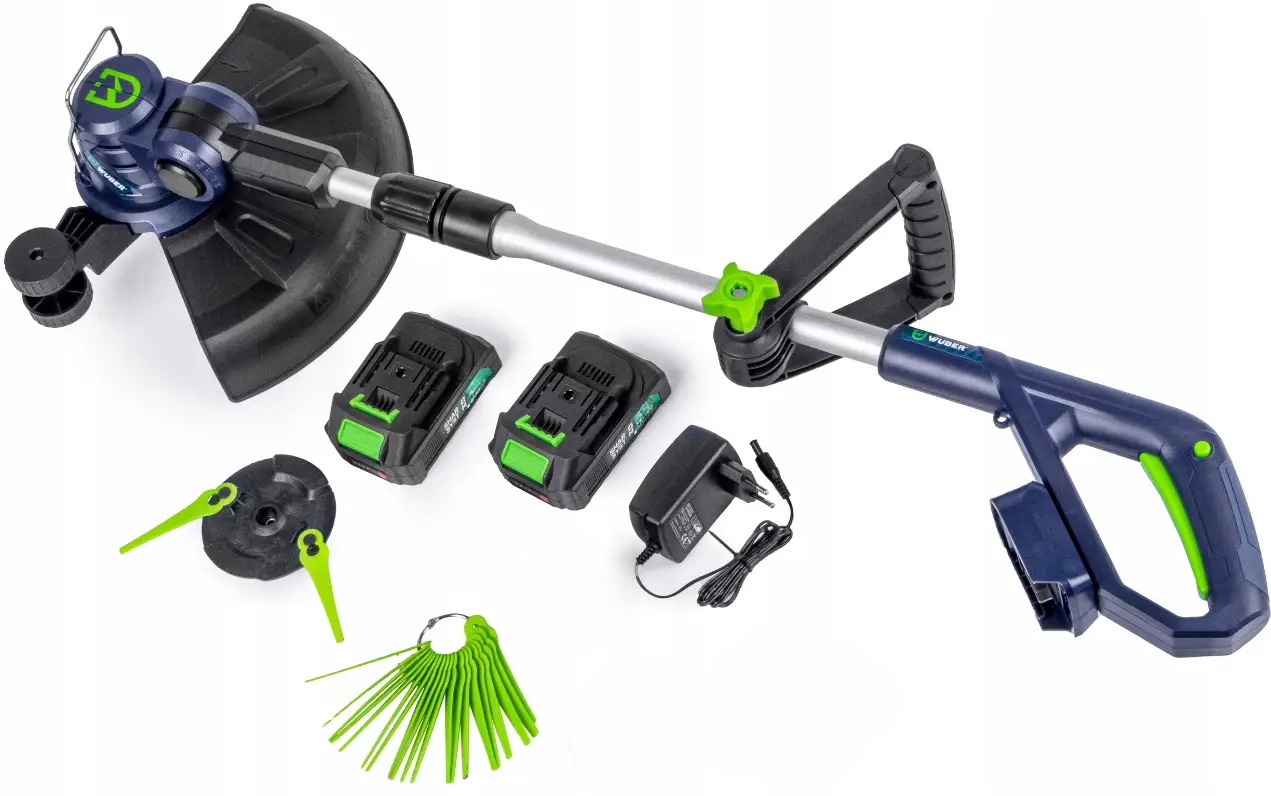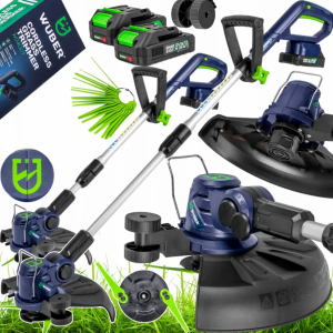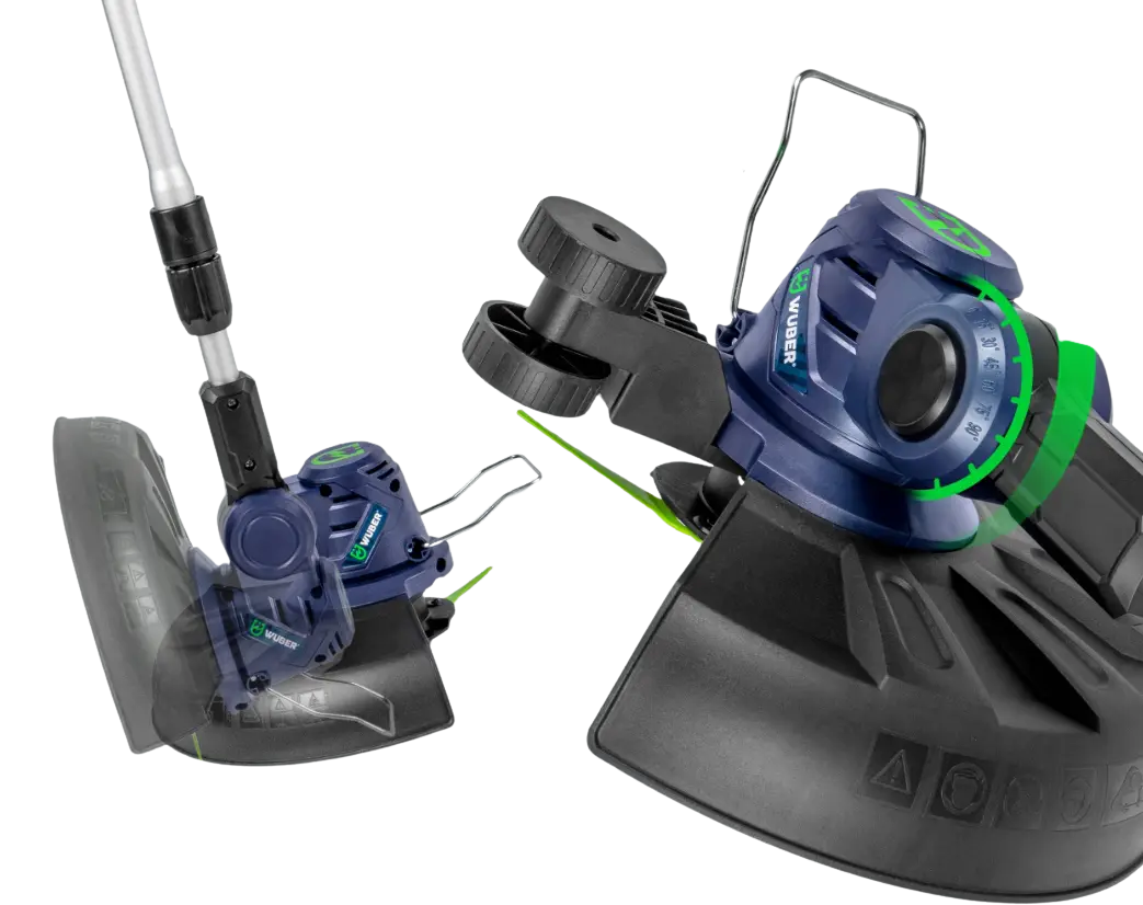 Акумуляторний тример WUBER із регульованим кутом нахилу головки для догляду за газоном та бур'янами, оснащений 2 АКБ 36V/5Ah, призначений для ефективного стриження.