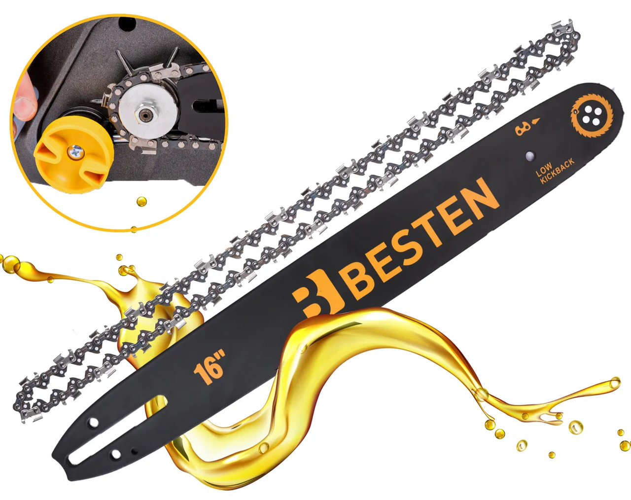 - Безключове натягування: дозволяє легко регулювати ланцюг без спеціального інструмента.