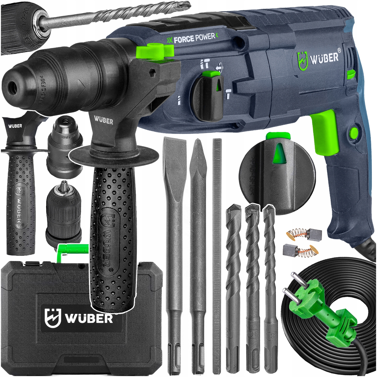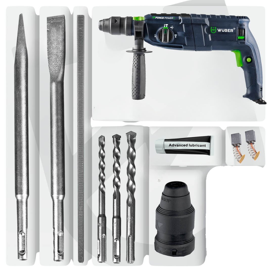 Перфоратор мережевий Wuber перфоратор з патроном SDS-plus та 3 режимами свердління в пластиковому кейсі із свердлами пікою та долотом