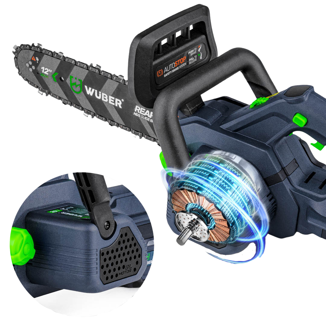 Аккумуляторная цепная пила WUBER с шиной 30 см для обрезки деревьев и веток в пластиковом кейсе с 2 АКБ 48V/5Ah