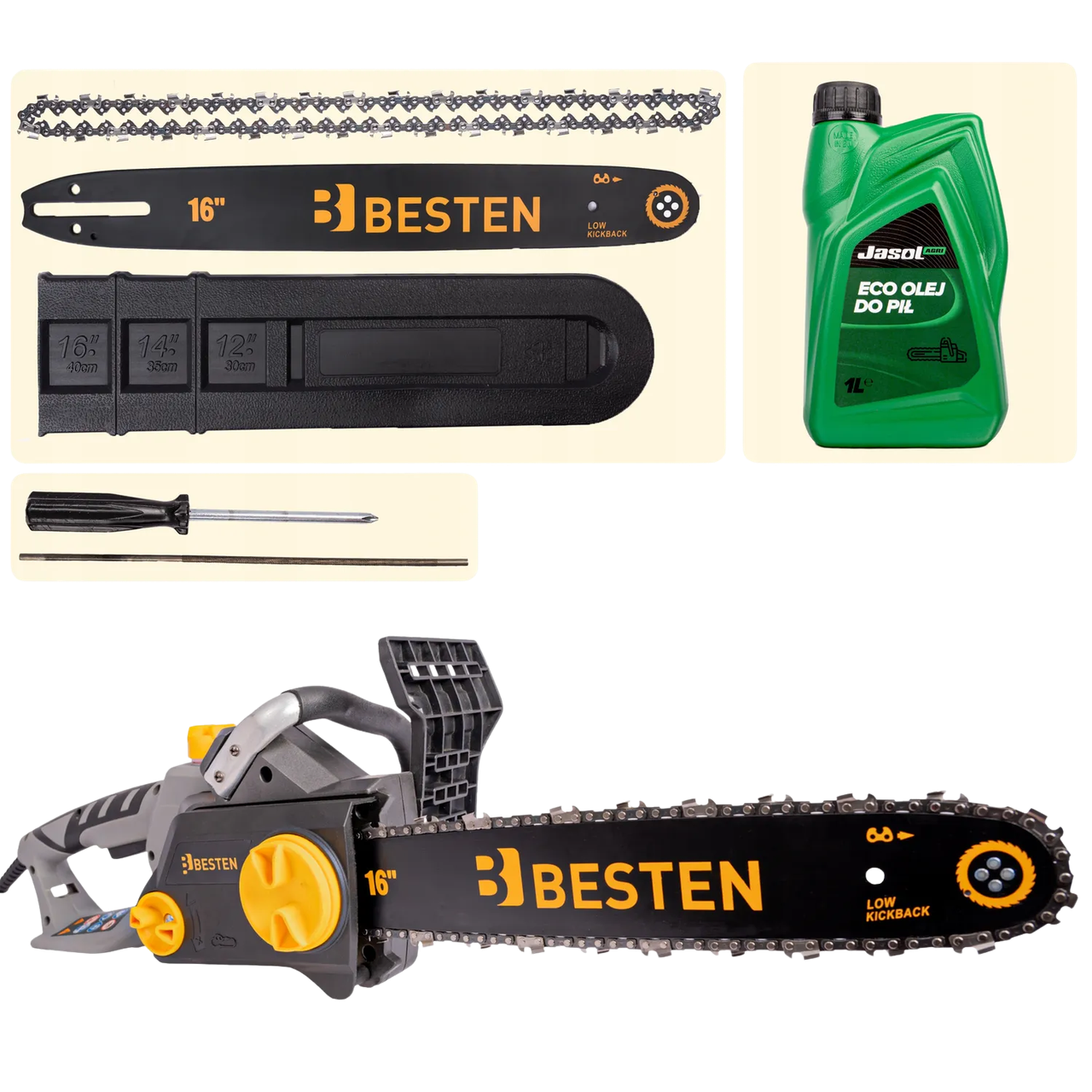 Мережева ланцюгова пила BESTEN електропила з безключовим натягуванням шина 36 см для обрізки гілок і дерев 2.2 кВт призначена для розпилювання деревини різної вологості. Цей інструмент підходить для садових робіт, столярства та розкрою дерев'яних плит завдяки зручній конструкції. Він є практичним рішенням для домашнього та професійного використання.